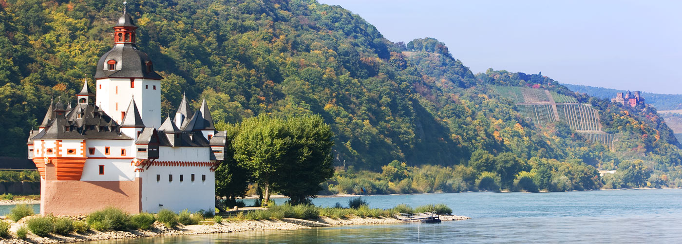 Flowers tumble from baskets lining streets of half-timbered houses, and lights glint off quiet canals. A mighty river carries ships and cargo through a landscape shaped by time and history. The spires of medieval churches and castles appear around each bend in the river, and vineyards climb the verdant hillsides.